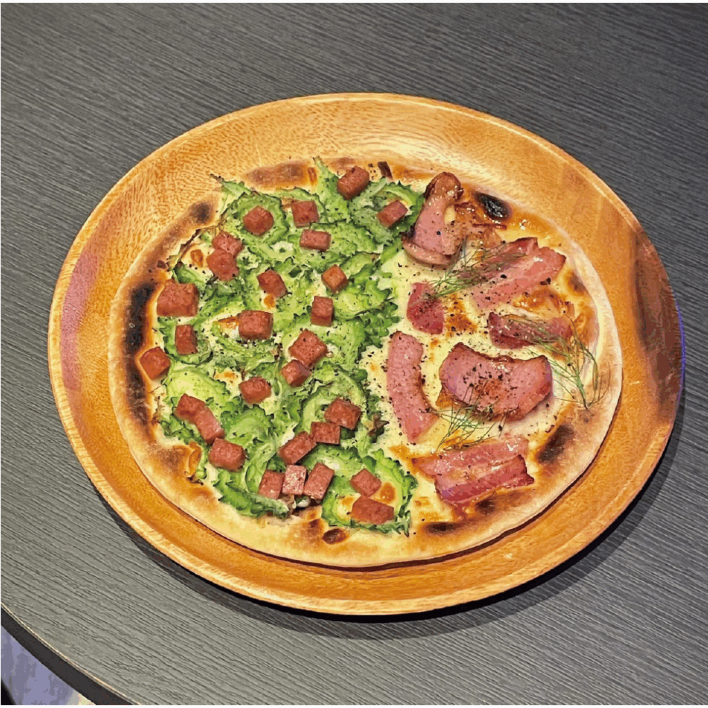 「え、ゴーヤのピザ!?」と思ったあなた、ぜひ一口食べてみて!島豚ベーコンの旨み × ゴーヤのほろ苦さ が絶妙にマッチ♪石垣島ならではの 驚きと美味しさ を一皿で体験!